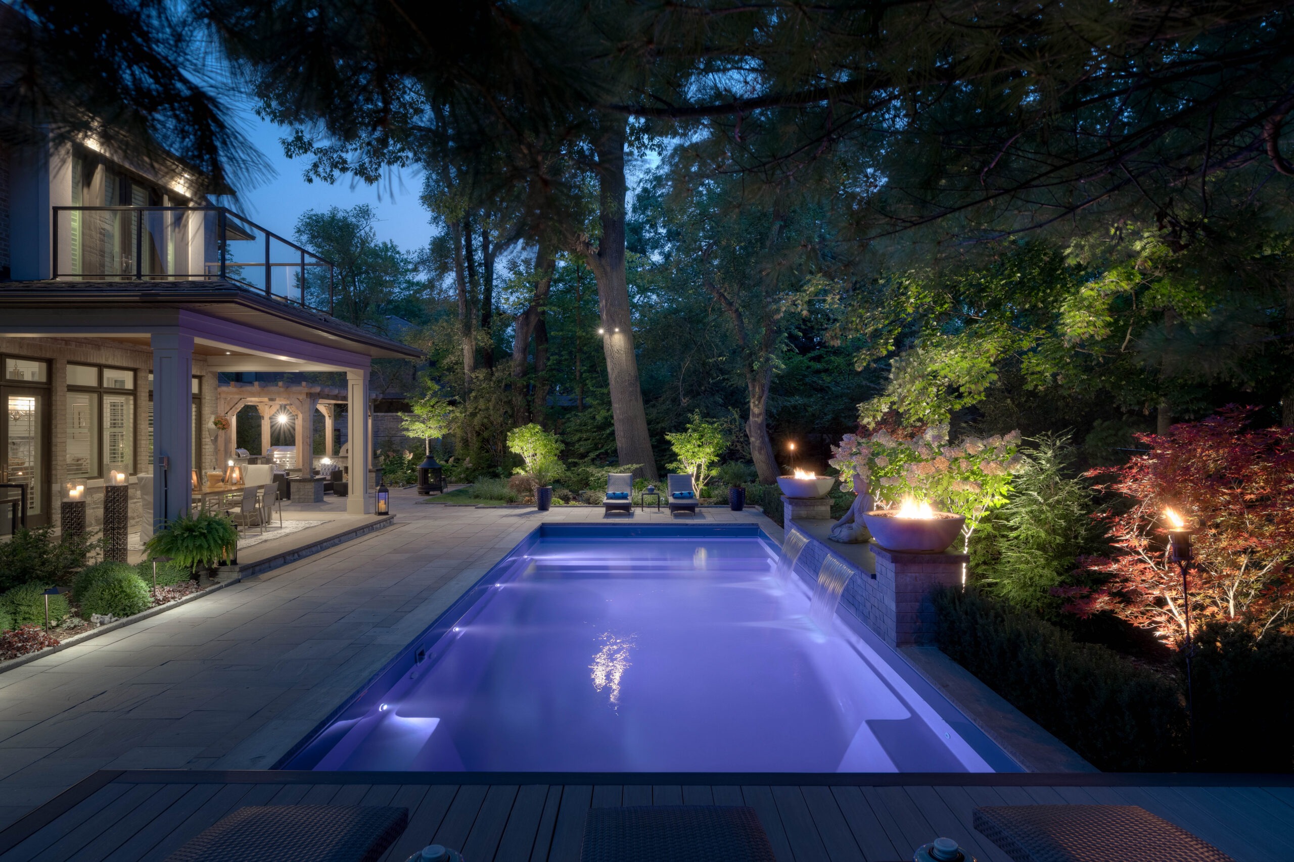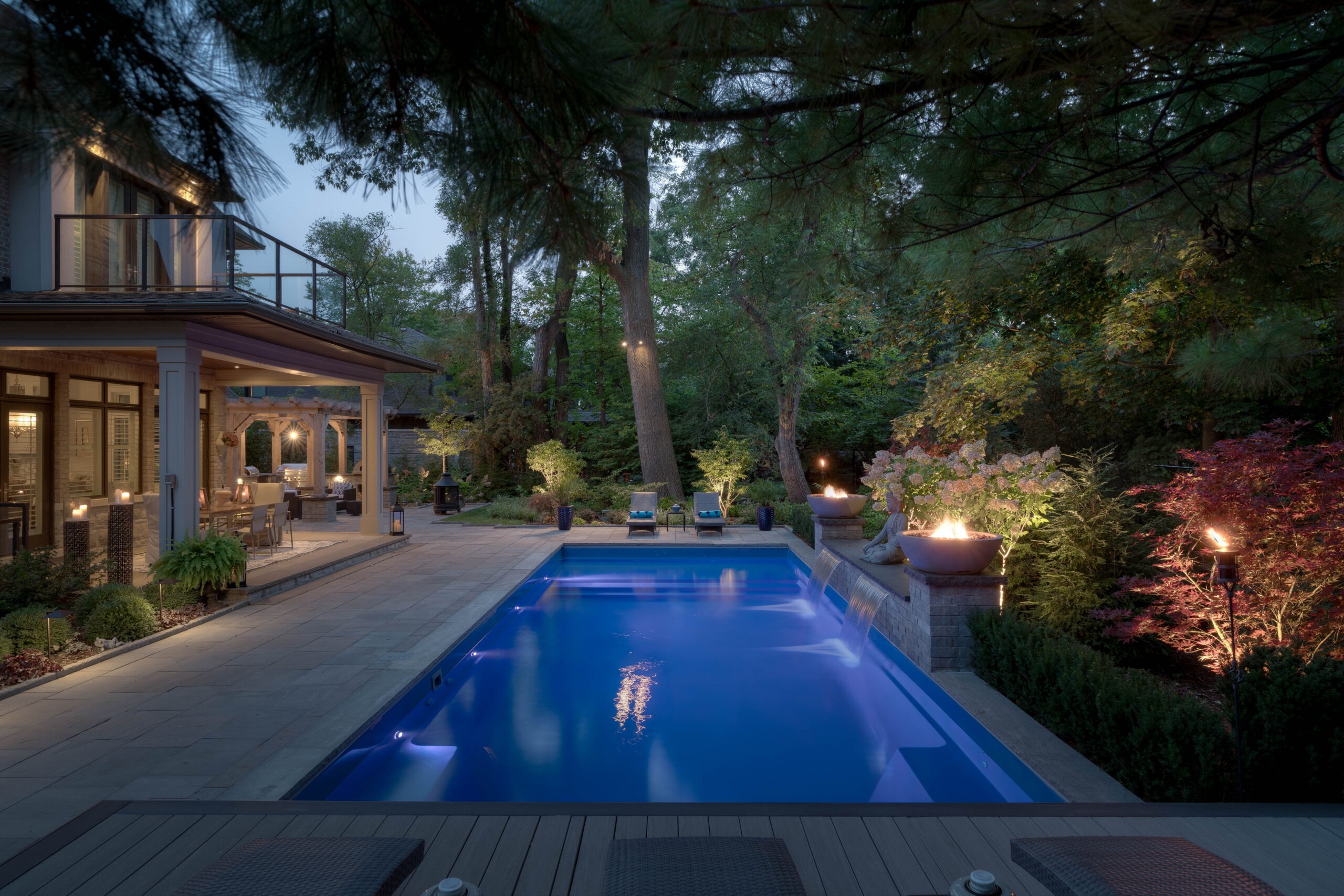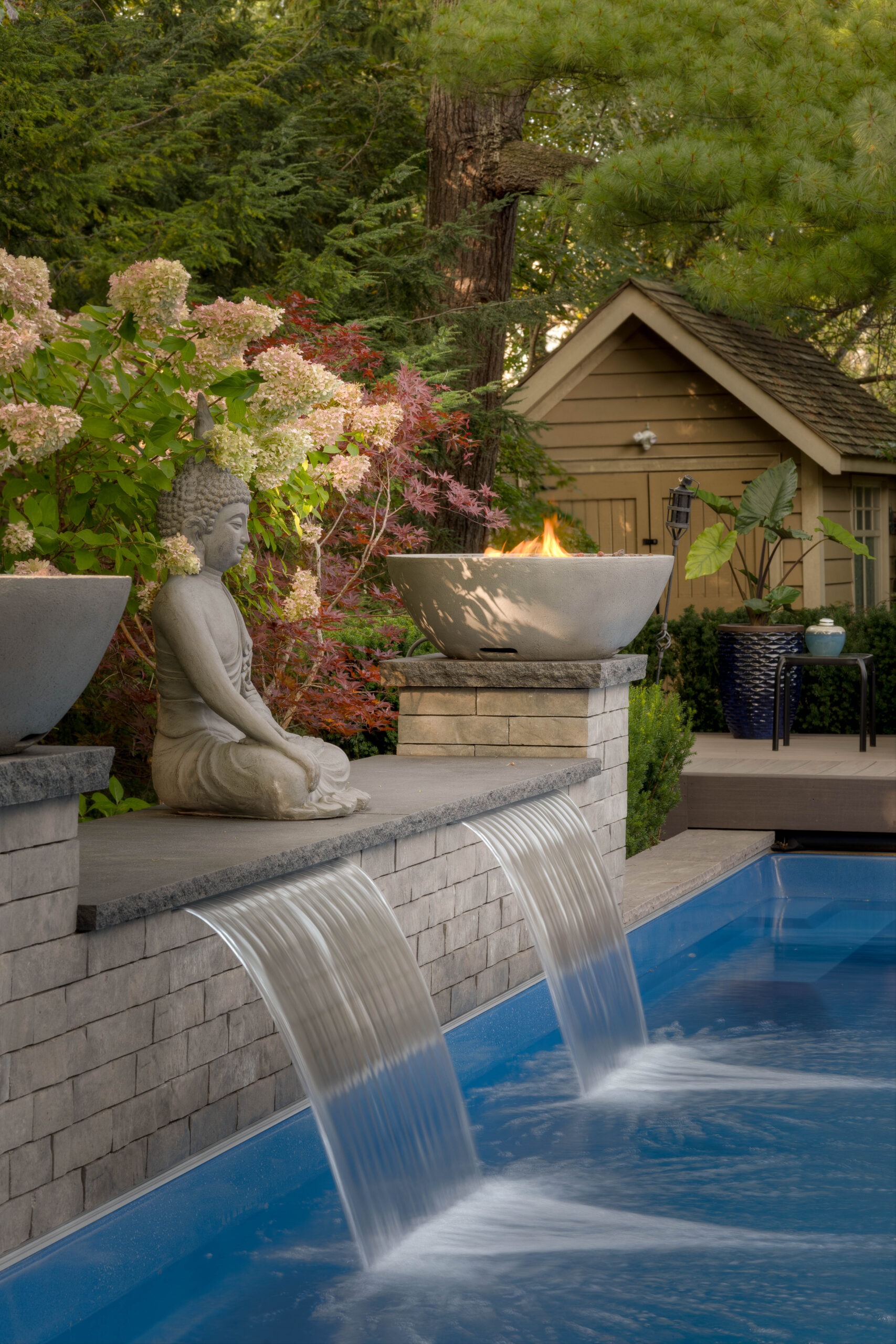 Our designer created a Ipe boardwalk through the backyard from the flagstone dining area, stepping over a reflective pond and pulling the space together, naturally drawing the eye to the focal point of the updated shed. The pond is filled with lighted spheres, casting a glowing ambiance at night.