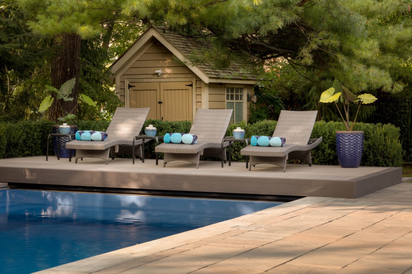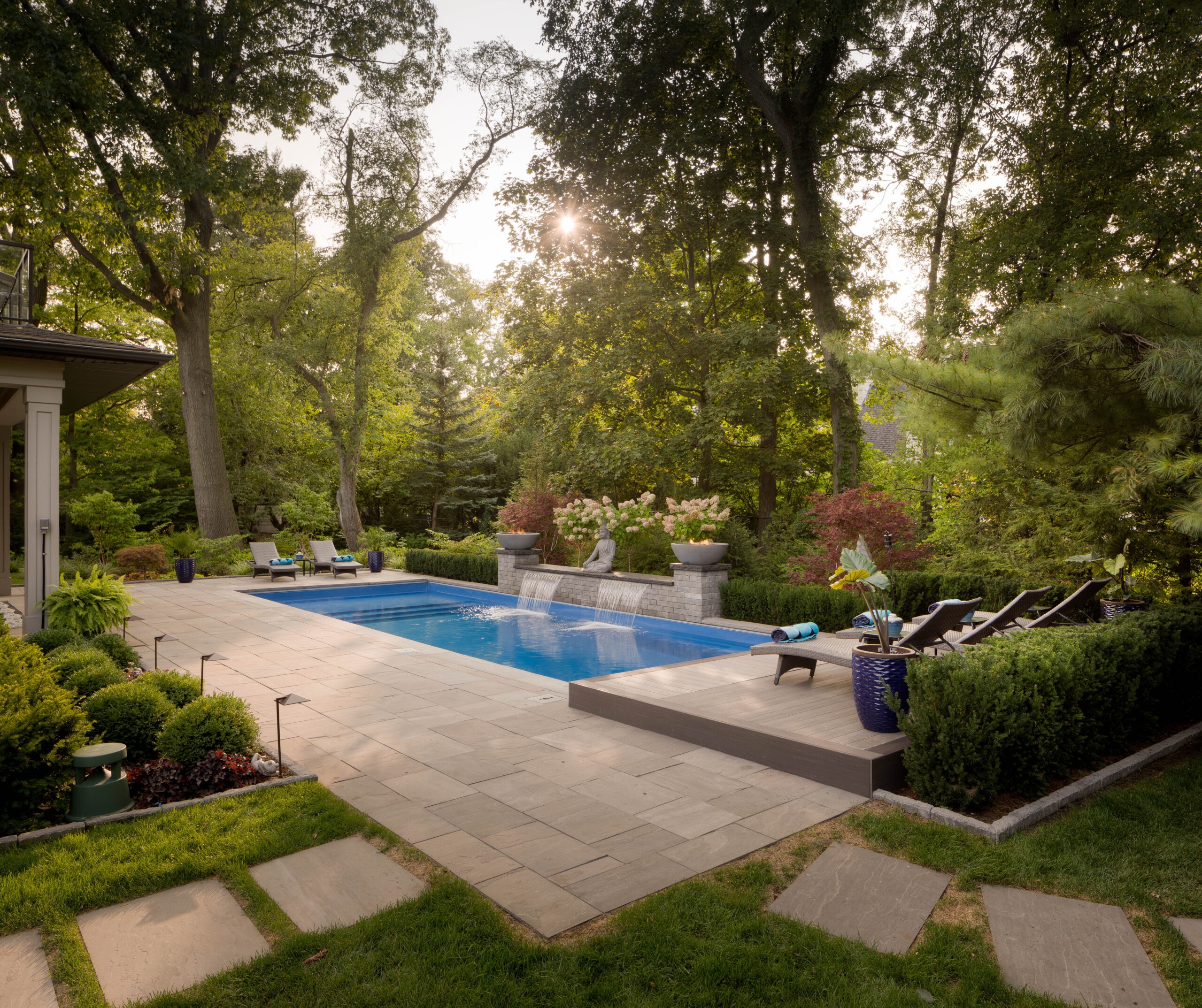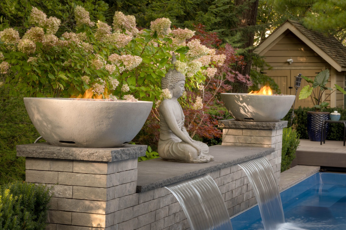 Our designer created a Ipe boardwalk through the backyard from the flagstone dining area, stepping over a reflective pond and pulling the space together, naturally drawing the eye to the focal point of the updated shed. The pond is filled with lighted spheres, casting a glowing ambiance at night.