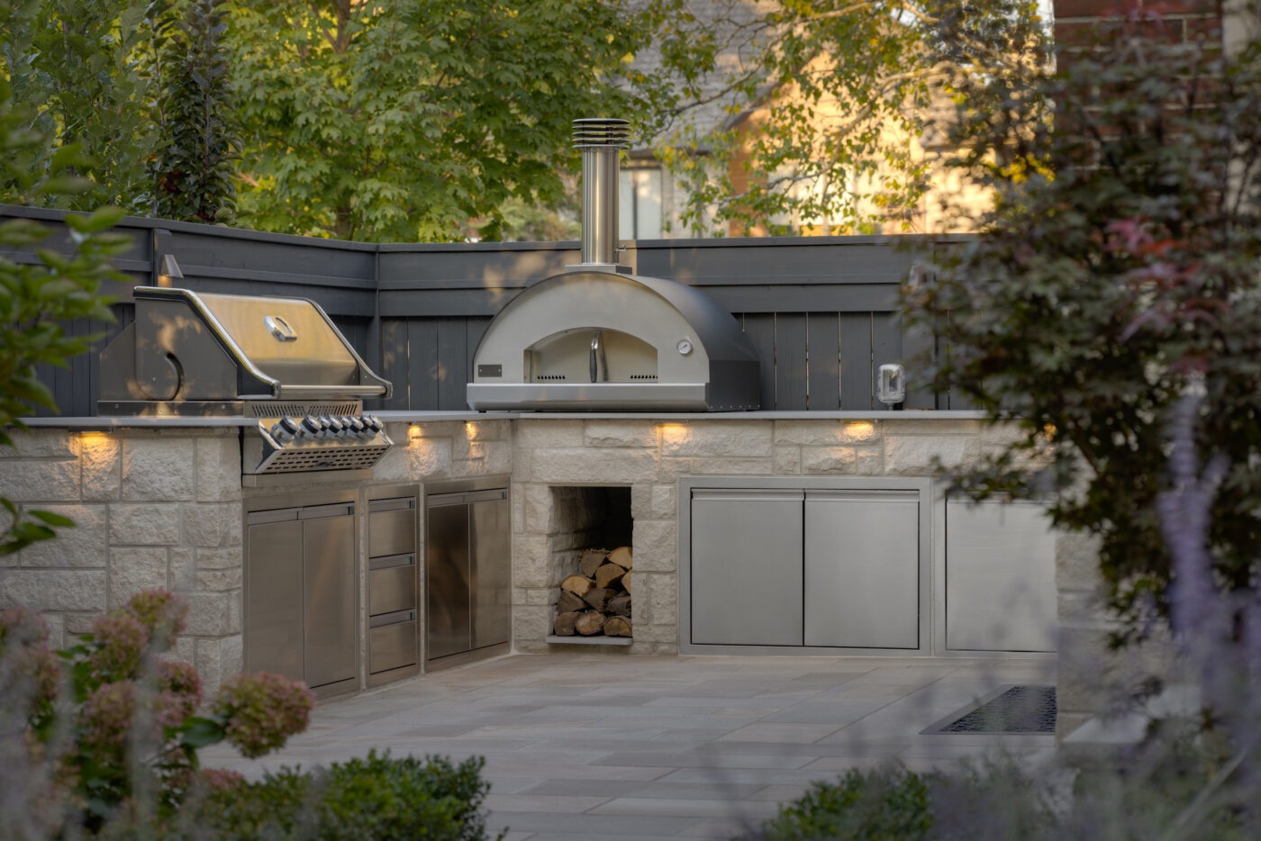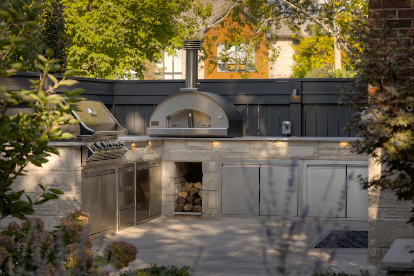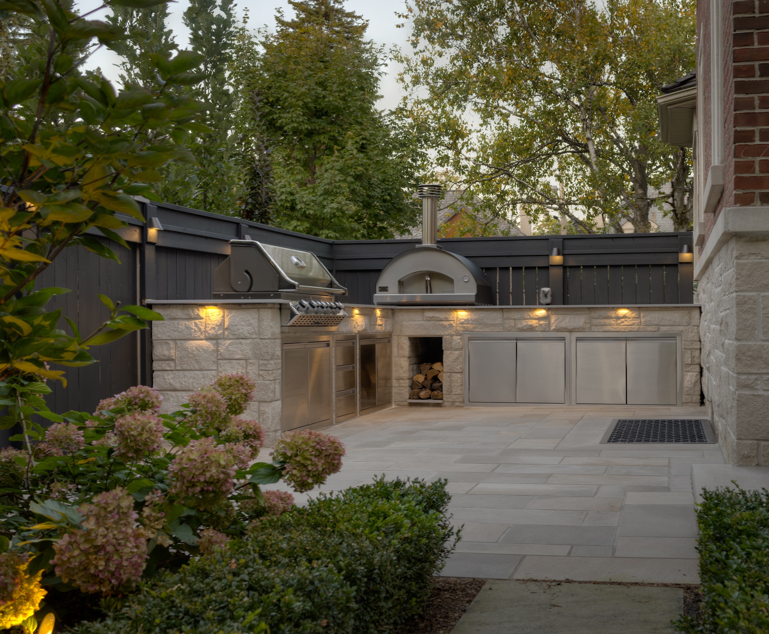 This Toronto outdoor kitchen is thoughtfully designed to balance convenience, privacy, and effortless entertaining. Crafted from natural limestone and custom masonry, the space features a built-in grill, integrated lower storage, and a wood-fired pizza oven, creating a functional yet elegant hub for outdoor cooking and gathering, making dining al fresco easy for family and guests.