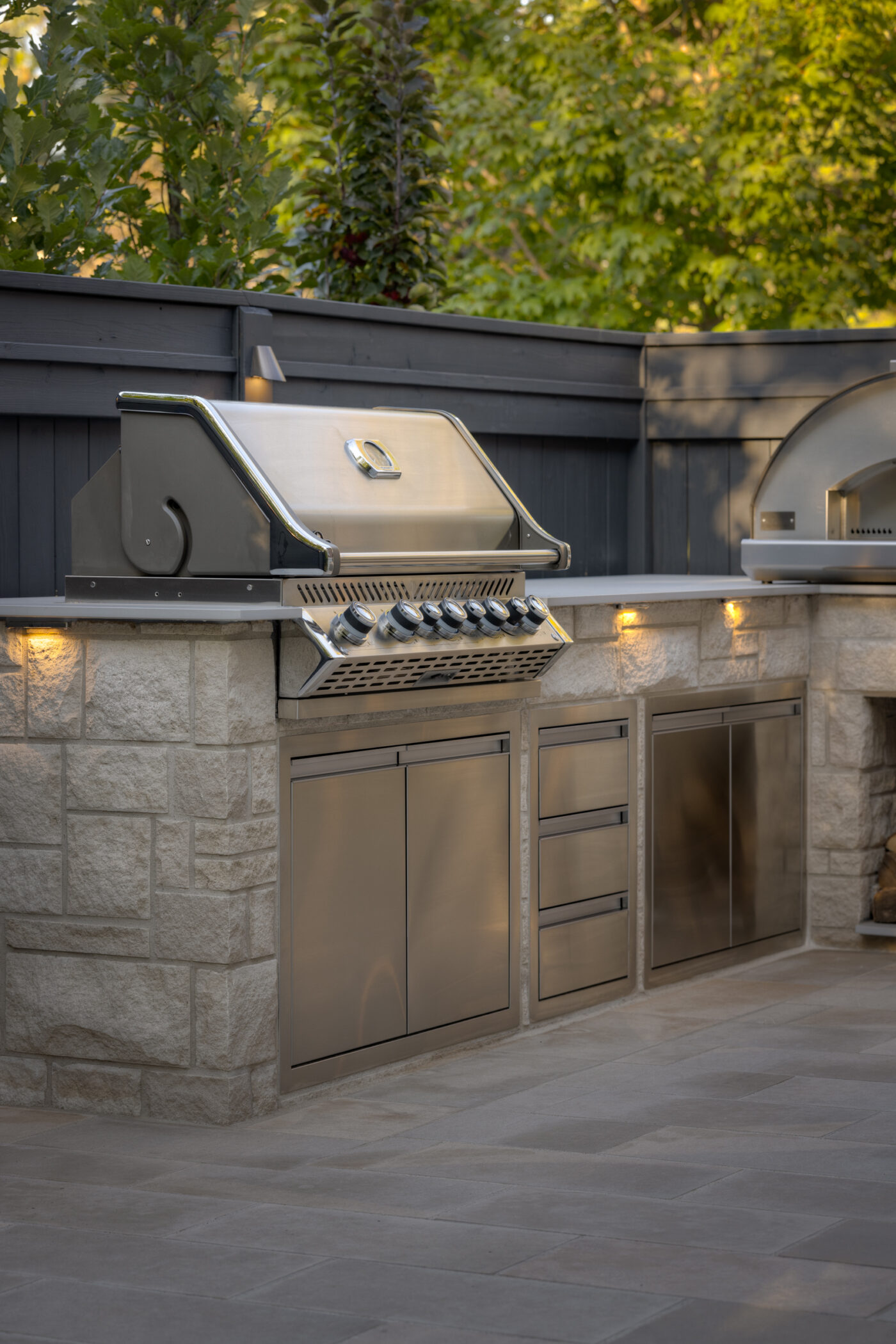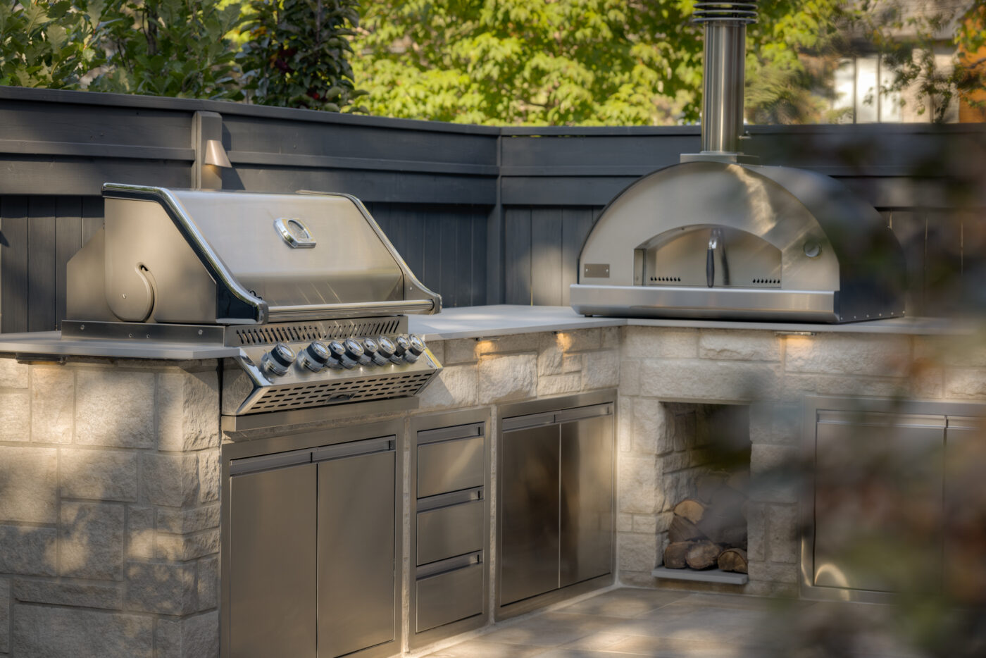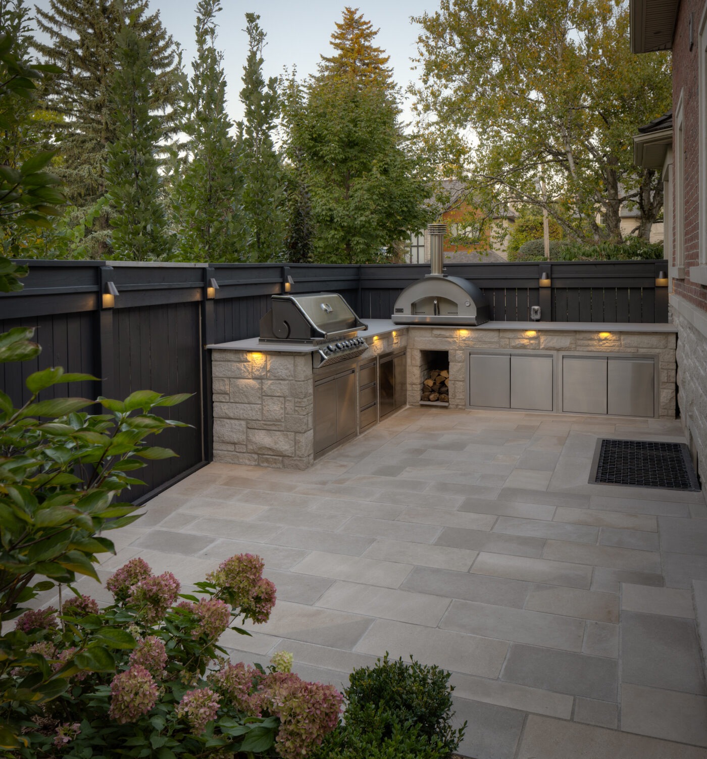 This Toronto outdoor kitchen is thoughtfully designed to balance convenience, privacy, and effortless entertaining. Crafted from natural limestone and custom masonry, the space features a built-in grill, integrated lower storage, and a wood-fired pizza oven, creating a functional yet elegant hub for outdoor cooking and gathering, making dining al fresco easy for family and guests.