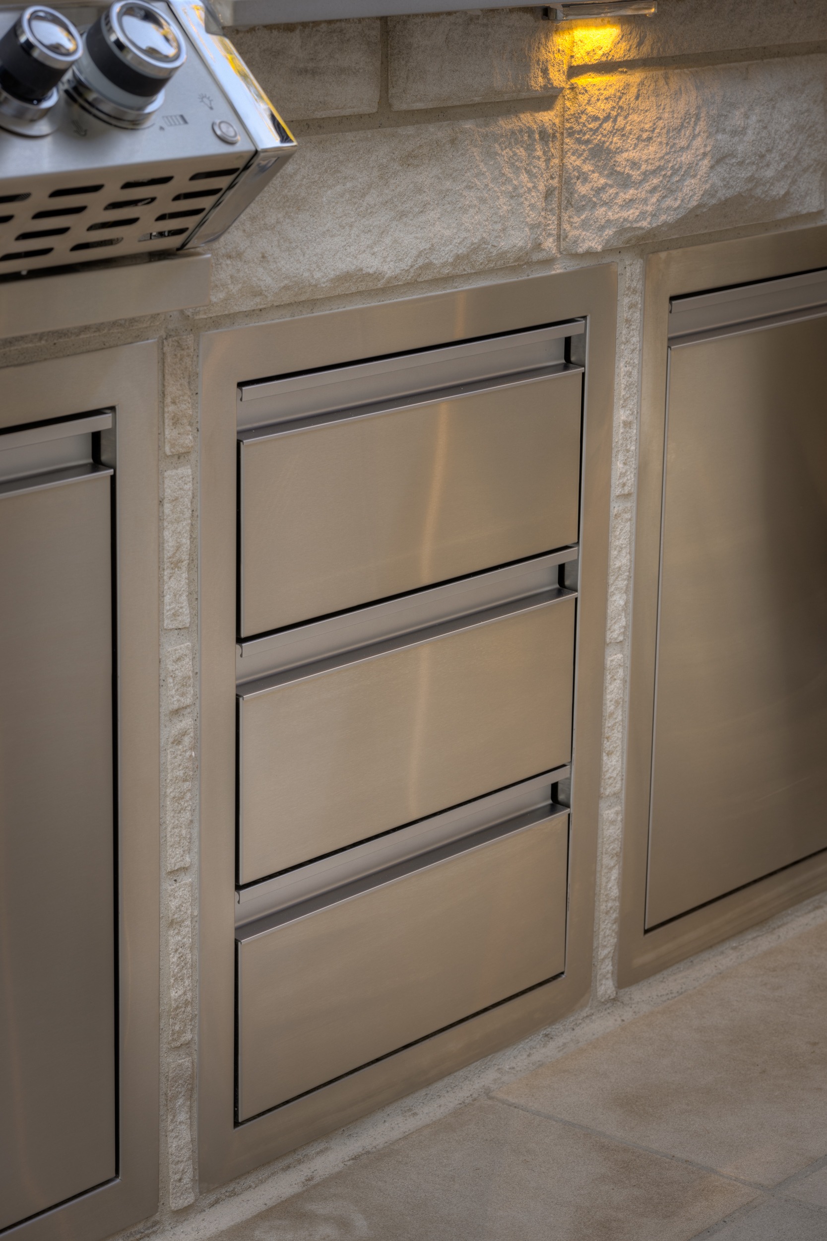 Located just off the kitchen door, this luxury outdoor kitchen in Toronto offers seamless indoor-outdoor flow while remaining privately tucked away from the restorative pool area. Generous circulation space allows guests to gather comfortably, making the kitchen ideal for both intimate dinners and lively entertaining—an enduring example of thoughtful materiality and purposeful spatial planning.