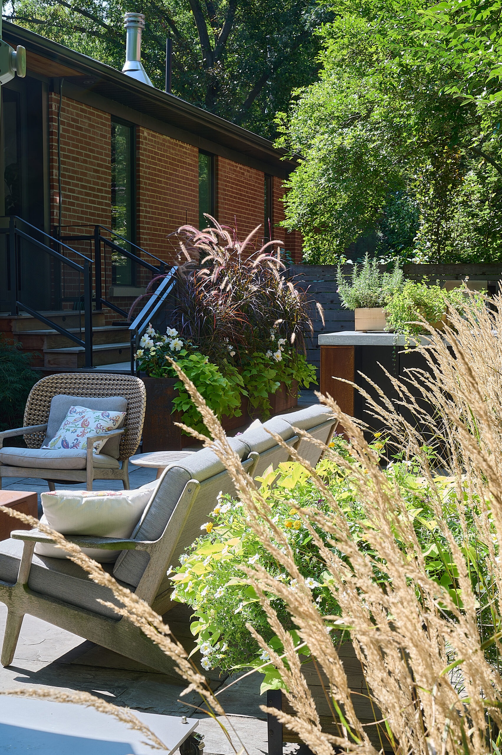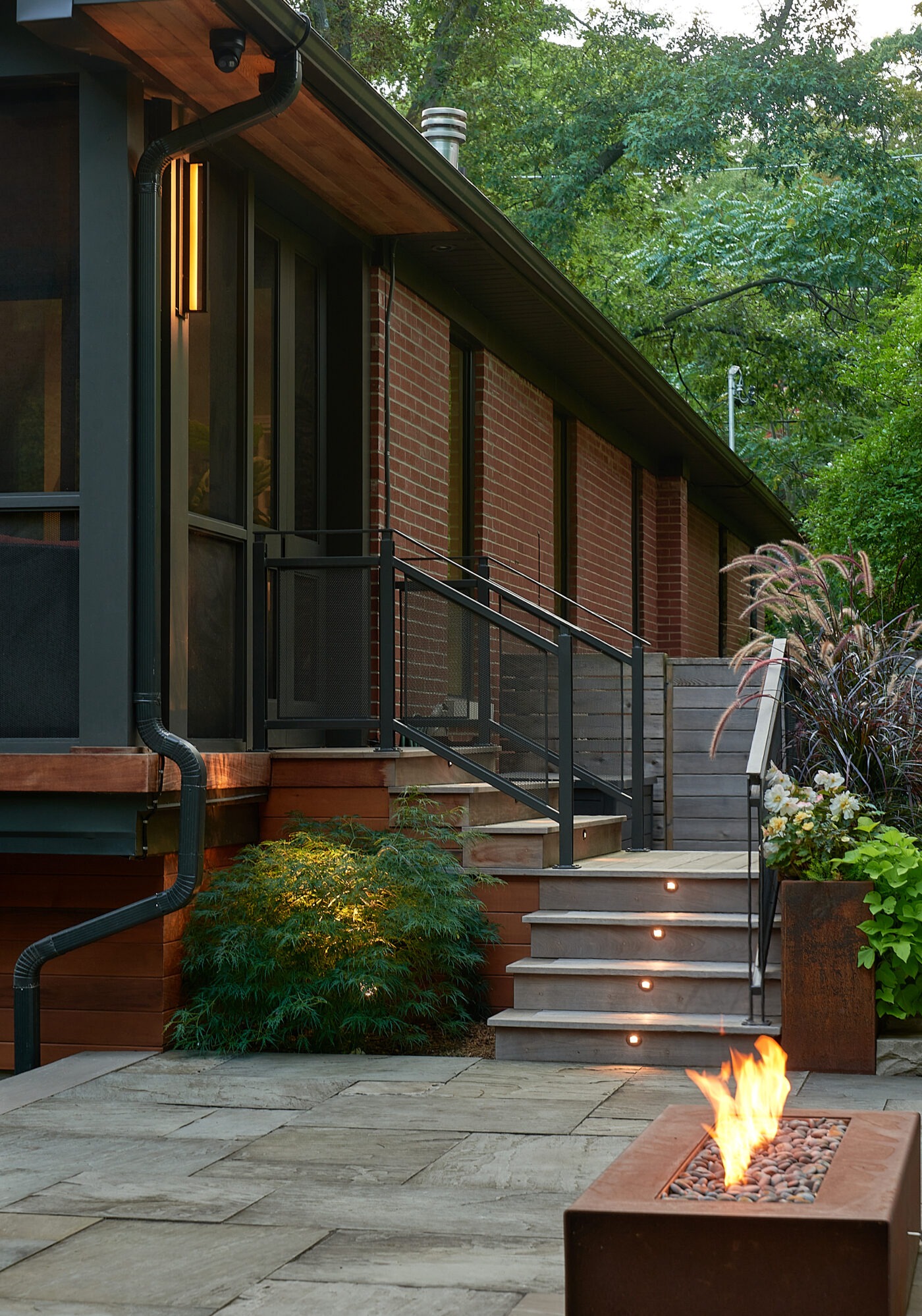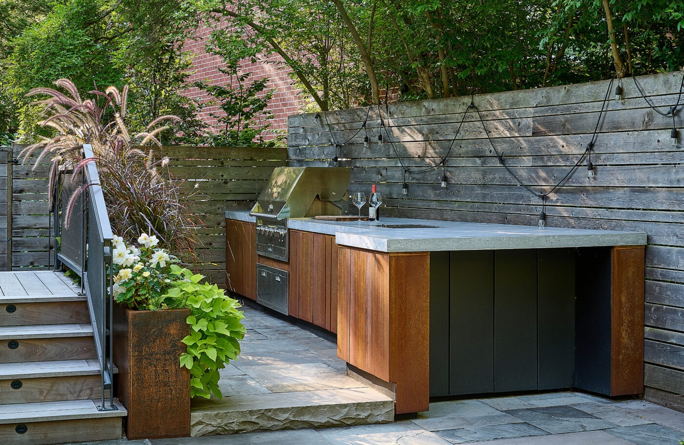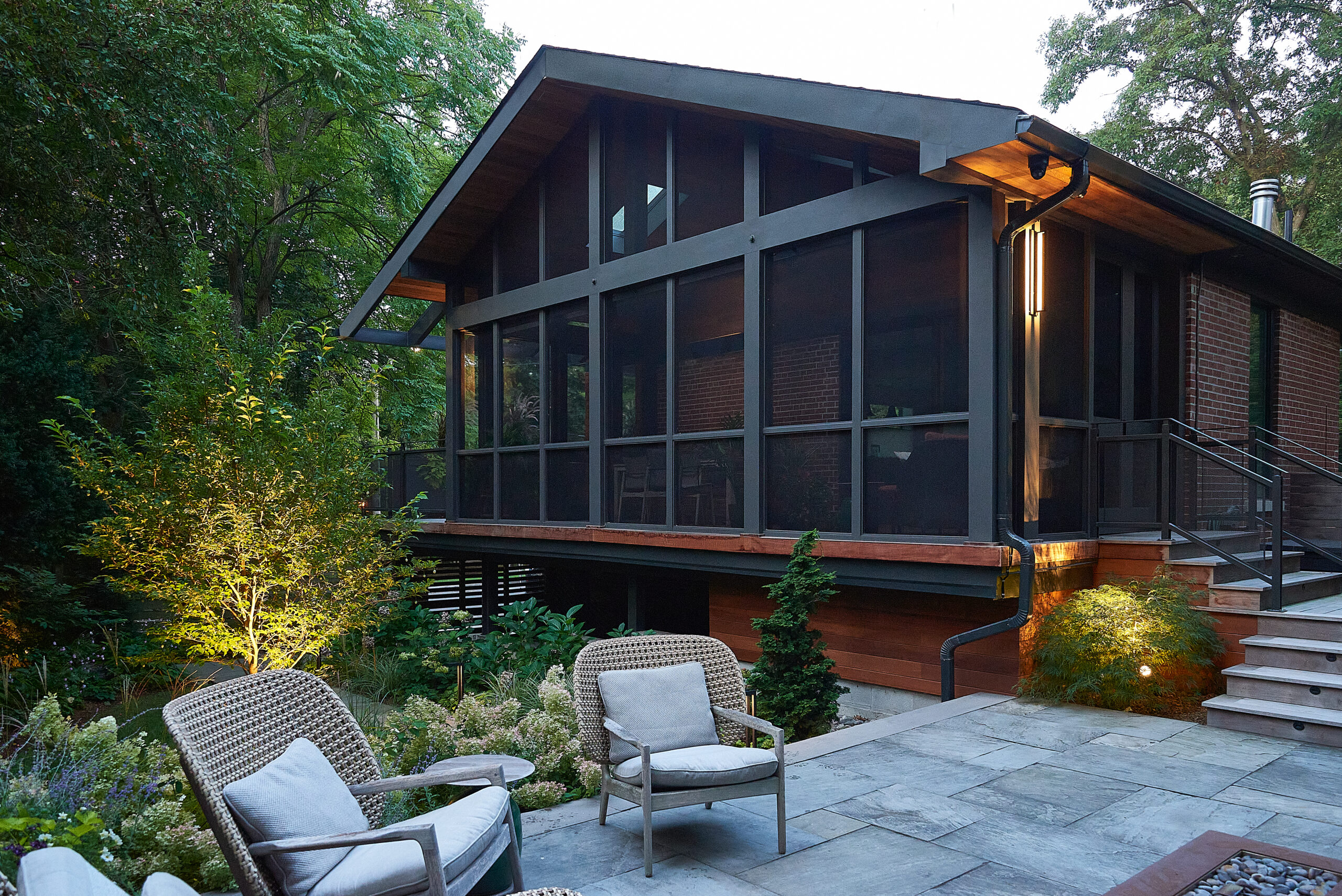 The existing deck has been transformed into a covered three-season room, seamlessly extending the home’s living space into the outdoors with an elevated view of High Park. Every element of this luxury Toronto backyard landscape balances sensory immersion, wellness, and functionality, creating a private retreat in the heart of the city where family, friends, and nature coexist in harmony.